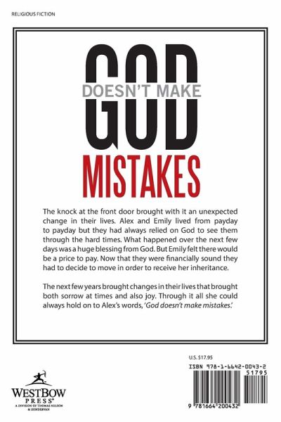 The knock at the front door brought with it an unexpected change in their lives. Alex and Emily lived from payday to payday but they had always relied on God to see them through the hard times. What happened over the next few days was a huge blessing from God. But Emily felt there would be a price to pay. Now that they were financially sound they had to decide to move in order to receive her inheritance. The next few years brought changes in their lives that brought both sorrow at times and also joy. Through it all she could always hold on to Alex's words, 'God doesn't make mistakes.'
