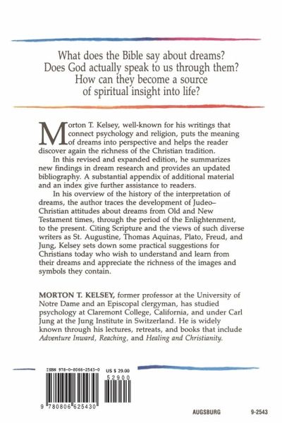 What does the Bible say about dreams? Does God actually speak to us through them? How can they become a source of spiritual insight into life?Morton T. Kelsey, well-known for his writings that connect psychology and religion, puts the meaning of dreams into perspective and helps the reader discover again the richness of the Christian tradition. In this revised and expanded edition, he summarizes new findings in dream research and provides an updated bibliography. A substantial appendix of additional material and an index give further assistance to readers. In his overview of the history of the interpretation of dreams, the author traces the development of Judeo-Christian attitudes about dreams from Old and New Testament times, through the period of the Enlightenment, to the present. Citing Scripture and the views of such diverse writers as St. Augustine, Thomas Aquinas, Plato, Freud, and Jung, Kelsey sets down some practical suggestions for Christians today who wish to understand and learn from their dreams and appreciate the richness of the images and symbols they contain.