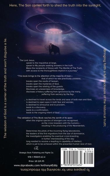 "I, The Lord Jesus, speak to the inquisitive at large, speak to My people seeking answers in the truth. Bless the recipients of Grace with The Mantle of The Truth, with access to the thoroughfares implicit in a journey." "This book brings to the attention of the majority of man - That of which he was previously unaware, breaks open the vaults of heaven, breaks open the mysteries of God, breaks open the relating of the guests. Discloses an unevenness of knowledge, Discloses a history suffering from ignorance by the many, Suffering from secrecy by the few. is destined to travel across the lands and seas of both man and God, is destined to open eyes in both fear and wonder, is destined to announce and to proclaim, leads to a discovery, leads to a confirmation, leads to the ongoing intent of God." The validation of This Book reaches the zenith of its apex: when the original species of strangers are recognized, as the cross breeder