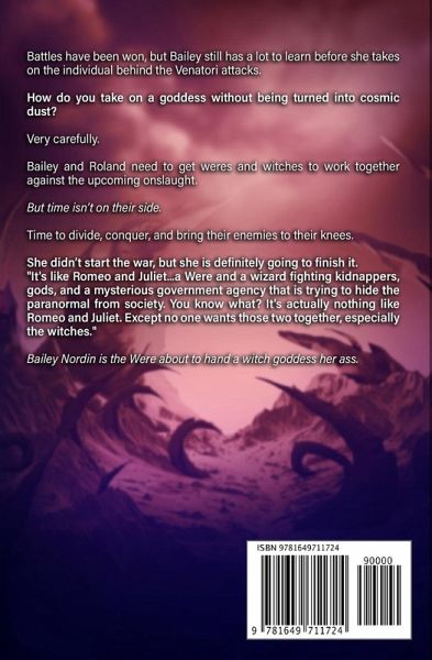 Battles have been won, but Bailey still has a lot to learn before she takes on the individual behind the Venatori attacks. How do you take on a goddess without being turned into cosmic dust? Very carefully. Bailey and Roland need to get weres and witches to work together against the upcoming onslaught. But time isn't on their side. Time to divide, conquer, and bring their enemies to their knees. She didn't start the war, but she is definitely going to finish it. "It's like Romeo and Juliet...a Were and a wizard fighting kidnappers, gods, and a mysterious government agency that is trying to hide the paranormal from society. You know what? It's actually nothing like Romeo and Juliet. Except no one wants those two together, especially the witches." Bailey Nordin is the Were about to hand a witch goddess her ass. Get your copy today and join Bailey as she finds out exactly what happens when she ends a goddess.