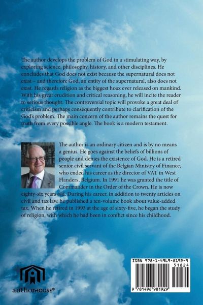 The author develops the problem of God in a stimulating way, by exploring science, philosophy, history, and other disciplines. He concludes that God does not exist because the supernatural does not exist - and therefore God, an entity of the supernatural, also does not exist. He regards religion as the biggest hoax ever released on mankind. With his great erudition and critical reasoning, he will incite the reader to serious thought. The controversial topic will provoke a great deal of criticism and perhaps consequently contribute to clarification of the God's problem. The main concern of the author remains the quest for truth from every possible angle. The book is a modern testament.