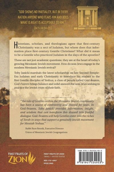 Gentiles & the God of Israel Historians, scholars, and theologians agree that first-century Christianity was a sect of Judaism, but where does that information place first-century Gentile Christians? What did it mean to be a Gentile who practiced Judaism in the days of the apostles? These are not just academic questions; they are at the heart of today's growing Messianic Jewish movement. How do non-Jews engage in the modern Messianic Jewish revival? Toby Janicki marshals the latest scholarship on late Second Temple-era Judaism and early Christianity to introduce his readers to the first Gentile disciples of Yeshua, a class of people called God-fearers. God-Fearers brings balance and solid answers for non-Jews seeking to practice the Jewish roots of their faith.