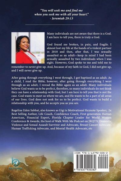 "You will seek me and find me when you seek me with all your heart."- Jeremiah 29:13 Many individuals are not aware that there is a God. I am here to tell you, there is truly a God. God found me broken, in pain, and fragile. I almost lost my life at the hands of a violent partner in 2018 and then, after that, I was sexually assaulted as an adult-keep in mind I had been sexually assaulted by two individuals when I was eight. However, God spoke to me and told me to remember to never give up. And, because of my faith in God, I did not give up, and I will never give up. After going through everything I went through, I got baptized as an adult. As a child, I read the Bible; however, after going through everything I went through as an adult, I reread the Bible again as an adult. Many individuals believe God wants us to be perfect, therefore, so many individuals do not think they can have a relationship with God, but I am here to tell you that is not the case. God wants to meet us where we are, and He wants to be a part of all areas of our lives. God does not seek for us to be perfect. God wants to build a relationship with you, and he accepts you as you are.