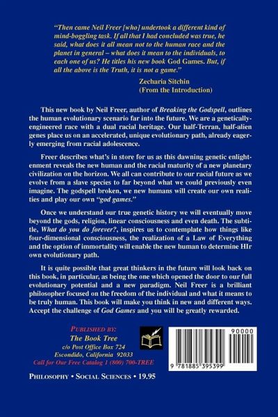 "Then came Neil Freer (who) undertook a different kind of mind-boggling task. If all that I had concluded was true, he said, what does it all mean not to the human race and the planet in general -- what does it mean to the individuals, to each one of us? He titles his new book God Games. But, if all the above is the Truth, it is not a game." Zecharia Sitchin (From the Introduction). This new book by Neil Freer, author of Breaking the Godspell, outlines the human evolutionary scenario far into the future. We are a genetically-engineered race with a dual racial heritage. Our half-Terran, half-alien genes place us on an accelerated, unique evolutionary path, already eagerly emerging from racial adolescence. Freer describes what's in store for us as this dawning genetic enlightenment reveals the new human and the racial maturity of a new planetary civilization on the horizon. We all can contribute to our racial future as we evolve from a slave species to far beyond what we could previously even imagine. The godspell broken, we new humans will create our own realities and play our own "god games." Once we understand our true genetic history we will eventually move beyond the gods, religion, linear consciousness and even death. The subtitle. What do you do forever?, inspires us to contemplate how things like four-dimensional consciousness, the realization of a Law of Everything and the option of immortality will enable the new human to determine his own evolutionary path. It is quite possible that great thinkers in the future will look back on this book, in particular, as being the one which opened the door to our full evolutionary potential and a new paradigm. Neil Freer is a brilliantphilosopher focused on the freedom of the individual and what it means to be truly human. This book will make you think in new and different ways. Accept the challenge of God Games and you will be greatly rewarded.