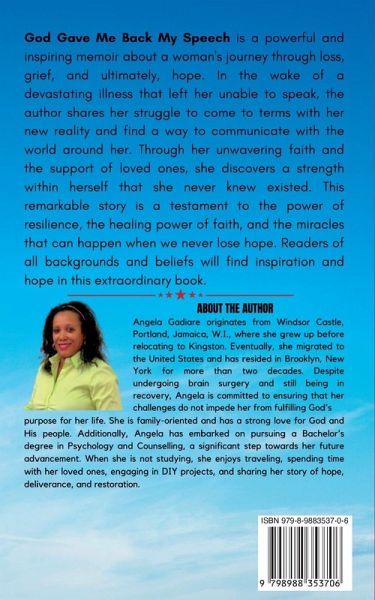 God Gave Me Back My Speech is a powerful and inspiring memoir about a woman's journey through loss, grief, and hope. In the wake of a devastating illness that left her unable to speak, the author shares her struggle to come to terms with her new reality and find a way to communicate with the world around her. Through her unwavering faith and the support of loved ones, she discovers a strength within herself that she never knew existed. This remarkable story is a testament to the power of resilience, the healing power of faith, and the miracles that can happen when we never lose hope. Readers of all backgrounds and beliefs will find inspiration and hope in this extraordinary book.