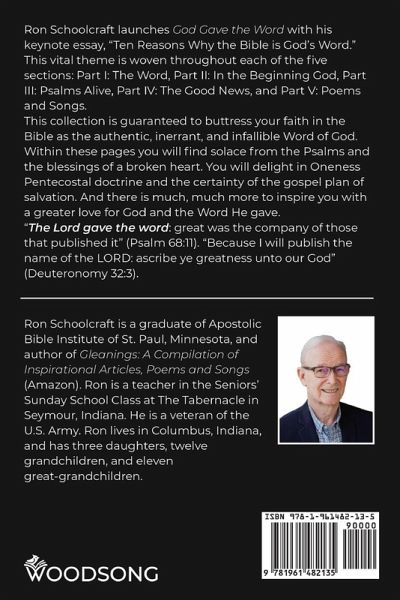 Ron Schoolcraft launches God Gave the Word with his keynote essay, "Ten Reasons Why the Bible is God's Word." This vital theme is woven throughout each of the five sections: Part I: The Word, Part II: In the Beginning God, Part III: Psalms Alive, Part IV: The Good News, and Part V: Poems and Songs. This collection is guaranteed to buttress your faith in the Bible as the authentic, inerrant, and infallible Word of God. Within these pages you will find solace from the Psalms and the blessings of a broken heart. You will delight in Oneness Pentecostal doctrine and the certainty of the gospel plan of salvation. And there is much, much more to inspire you with a greater love for God and the Word He gave. "The Lord gave the word: great was the company of those that published it" (Psalm 68:11). "Because I will publish the name of the LORD: ascribe ye greatness unto our God" (Deuteronomy 32:3).