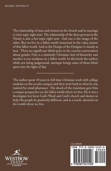 The relationship of men and women in the church and in marriage is a hot topic right now. The relationship of the three persons in the Trinity is also a hot topic right now. And one is the image of the other. But we live in a fallen world immersed in the value system of this fallen world. And so the Design of the Designer is cloudy at best. There are significant blind spots in the current conversation about gender. One is a distinctly Christian view of hierarchy and another is our residence in a fallen world. In this book the author, while not being judgmental, attempts brings some of those blind spots into the light of day.