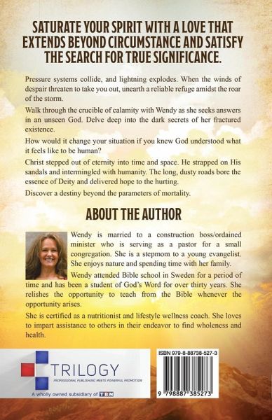 SATURATE YOUR SPIRIT WITH A LOVE THAT EXTENDS BEYOND CIRCUMSTANCE AND SATISFY THE SEARCH FOR TRUE SIGNIFICANCE. Pressure systems collide, and lighting explodes. When the winds of despair threaten to take you out, unearth a reliable refuge amidst the roar of the storm. Walk through the crucible of calamity with Wendy as she seeks answers in an unseen God. Delve deep into the dark secrets of her fractured existence. How would it change your situation if you know God understood what it feels like to be human? Christ stepped out of eternity into time and space. He strapped on His sandals and intermingled with humanity. The long, dusty roads bore the essence of Deity and delivered hope to the hurting. Discover a destiny beyond the parameters of mortality.
