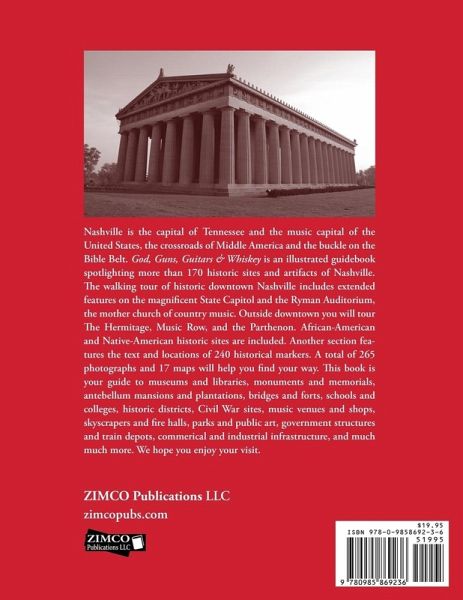 Nashville, the capital of Tennessee, offers a treasure trove of fascinating historic sites to explore. In the process you will learn the stories of our ancestors, the journeys they undertook, and the trials and tribulations they encountered. Along the way you will explore museums of all types, historic buildings and significant architecture, antebellum mansions, monuments and memorials, sculptures and public art, battlefields, artifacts, and markers. God, Guns, Guitars & Whiskey (which features 265 photographs and 17 maps) begins with a walking tour of historic downtown Nashville that spotlights more than 70 sites. The tour will take you from the historic riverfront to the centers of municipal and state government, along Church Street with its eclectic architecture, down the Victorian-era warehouse row, and then up Broadway, home to many of Nashville’s music venues—from symphony halls to honky tonks. This section also includes feature articles on the Tennessee State Capitol and Ryman Auditorium and a listing of Native-American historic sites. The next section covers nearly 100 historic sites of Nashville-Davidson County outside the downtown area and includes a feature article on the Tennessee Centennial Exposition and a listing of African-American historic sites. Descriptions and articles include Centennial Park, Music Row, Vanderbilt University and other West End attractions; the North Nashville and Germantown historic districts; the College Hill and South Nashville districts; several Civil War sites; and historic Edgefield and East Nashville. The final section contains the text and locations of 240 historical markers in Nashville-Davidson County.