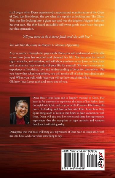 It all began when Dona experienced a supernatural manifestation of the Glory of God, just like Moses. She saw what she explains as looking into The Glory. This was like looking into a giant sun and was the brightest biggest light she has ever seen. She then heard an audible still sweet gentle male voice that gave her this instruction. "All you have to do is have faith and she will live." You will find this story in chapter 1, Glorious Appearing As you journey through the pages with Dona you will understand and be able to see how Jesus has touched and changed her life. She has seen for herself signs, miracles, and wonders, and will show you how to see Jesus, to hear Jesus and experience Jesus every day of your life for yourself. She wants everyone to experience a friendship, love and understanding of Jesus for themselves. Did you know that when you believe, you will receive all of what Jesus died to give you? When you walk with Jesus you will see how much fun He is. Oh how Jesus Loves each and every one of you. Dona Beyer loves Jesus and is happily married to Scott. Her heart is for everyone to experience the heart of her Father, Jesus through Holy Spirit, and to grow in His Presence, His Power, His Love, His leading, and how to flow with Him. Learn how Holy Spirit brings each of us into that heart to heart connection with Jesus. Dona will give you her stories and share her supernatural experiences that she recognizes as signs miracles and wonders that Jesus is still doing today. Dona prays that this book will bring you expressions of Jesus heart as you journey with her into how God always has something to say.