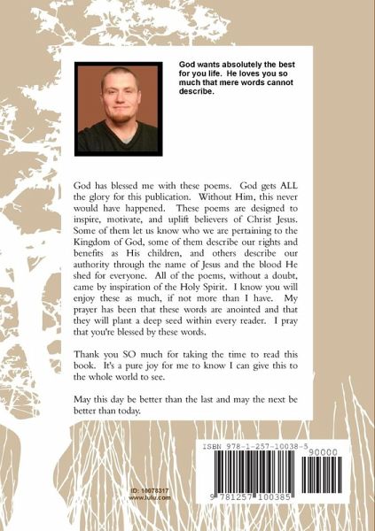 This collection of poetry is literally direct inspiration from God. Poems referring to our authority through Christ Jesus, How much God loves us, how we are supposed to take responsibility in this world and many other uplifting rhymes. A few are written directly from God's perspective, as if He's speaking directly to you. Regardless, they're all for the entire Body of Christ.