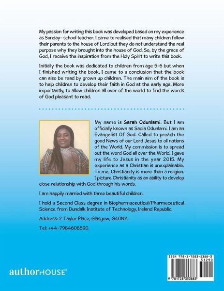 My passion for writing this book was developed based on my experience as Sunday- school teacher, I came to realised that many children follow their parents to the house of Lord but they do not understand the real purpose why y they brought into the house of God. So, by the grace of God, I receive the inspiration from the Holy Spirit to write this book. Initially the book was dedicated to children from age 5-6 but when I finished writing the book, I came to a conclusion that the book can also be read by grown up children. The main aim of the book is to help children to develop their faith in God at the early age. More importantly, to allow children all over of the world to find the words of God pleasant to read.