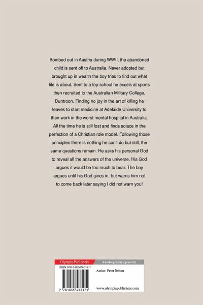 Bombed out in Austria during WWII, the abandoned child is sent off to Australia. Never adopted but brought up in wealth the boy tries to find out what life is about. Sent to a top school he excels at sports then recruited to the Australian Military College, Duntroon. Finding no joy in the art of killing he leaves to start medicine at Adelaide University to then work in the worst mental hospital in Australia. All the time he is still lost and finds solace in the perfection of a Christian role model. Following those principles there is nothing he can't do but still, the same questions remain. He asks his personal God to reveal all the answers of the universe. His God argues it would be too much to bear. The boy argues until his God gives in, but warns him not to come back later saying I did not warn you!