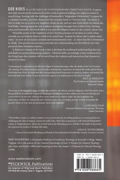 GOD HIDES is a critique of contemporary christian faith. It argues that faith should not be understood as the result of spiritual seeking, but rather as rooted in moral living. Starting with the challenge of Bonhoeffer's ""religionless Christianity,"" it argues for a common morality, and then shows how that morality leads to Christian faith. The thesis is that in order for us to serve our neighbor whom we see, and not seek God whom we cannot see, God hides. Drawing upon the rich tradition of religious thought from Luther, Kant, Kierkegaard, and Bonhoeffer, this book offers a way past the religious battles in the current culture war. Wisnefske points to the emptiness of the Christian promise of salvation in a time when virtually no one believes there is a hell to be saved from. Instead, he shows that it makes sense today--in view of our nuclear arsenals and environmental crisis--to claim that life is threatened by death. Our present circumstances provide new understanding into the biblical view that primeval chaos threatens creation. A distinctive feature of the book is that it develops the traditional understanding that sin and death are powers threatening creation. Christian faith, accordingly, is best understood as the living hope that creation will be saved from the violence and destruction that threaten to return it to chaos.