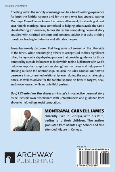 Cheating within the sanctity of marriage can be a heartbreaking experience for both the faithful spouse and for the one who has strayed. Author Montrayal Carnell James knows the feeling all too well; his cheating almost cost him his marriage. Now committed to helping others avoid the same life-shattering experiences, James shares his compelling personal story coupled with spiritual wisdom and concrete advice that asks probing questions leading to behavior and attitude changes. James has already discovered that the grass is not greener on the other side of the fence. While encouraging others to accept God as their significant other, he lays out a step-by-step process that provides guidance for those tempted by outside influences to look within to find fulfillment with God’s help—an important step that can strengthen marriages and help prevent straying outside the relationship. He also includes counsel on how to persevere in a committed relationship, even during the most challenging times, as well as advice for the faithful spouse on how to forgive, heal, and move forward with an unfaithful partner. God, I Cheated on You shares a minister’s introspective personal story as he uses his own experiences with unfaithfulness and guidance from above to help others resist temptation.
