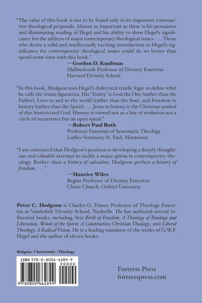 "The value of this book is not to be found only in its important constructive theological proposals. Almost as important as these is his persuasive and illuminating reading of Hegel and his ability to show Hegel's significance for the address of major contemporary theological issues.... Those who desire a solid and intellectually exciting introduction to Hegel's significance for contemporary theological issues could do no better than spend some time with this book." -- Gordon D. Kaufman, Mallinckrodt Professor of Divinity Emeritus, Harvard Divinity School "In this book, Hodgson uses Hegel's dialectical triadic logic to define what he calls the triune figuration. His 'Trinity' is God the One (rather than the Father), Love to and in the world (rather than the Son), and Freedom in history (rather than the Spirit).... Jesus in history is the Christian symbol of this historicized God. History is viewed not as a line of evolution nor a circle of recurrence but an open spiral." -- Robert Paul Roth, Professor Emeritus of Systematic Theology, Luther Seminary, St. Paul, Minnesota "I am convinced that Hodgson's position is developing a deeply thought-out and valuable attempt to tackle a major aporia in contemporary theology. Rather than a history of salvation, Hodgson prefers a history of freedom...." -- Maurice Wiles, Regius Professor of Divinity Emeritus, Christ Church, Oxford University