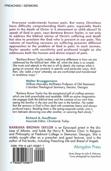 Everyone understands human pain. But many Christians have difficulty comprehending God's pain, especially God's pain in the death of Christ. Is it atonement or child abuse? To speak of God in pain, says Barbara Brown Taylor, is not only to address the biblical stories of Christ's suffering and death, but also to proclaim the God who is present in our pain. This volume of teaching sermons on suffering presents different approaches to the problem of God in pain. In each sermon, Taylor speaks with sensitivity and profound insight as she addresses pain and both its human and divine impact. TABLE OF CONTENTS Part I: Pain of Life: The Gift of Disillusionment; A Cure for Despair; Learning to Hate Your Family; Divine Anger; Feeding the Enemy; The Betrayer in Our Midst; Buried by Baptism; The Suffering Cup; Pick Up Your Cross; Unless a Grain Falls; The Dress Rehearsal; Surviving Crucifixion; Portents and Signs; and The Delivery Room. Part II: Pain of Death: Believing What We Cannot Understand; Someone to Blame; The Triumphant Victim; The Myth of Redemptive Violence; The Silence of God; The Will of God; The Suffering of God; May He Not Rest in Peace. BARBARA BROWN TAYLOR, an Episcopal priest in the diocese of Atlanta, holds the Butman Chair in Religion and Philosophy at Piedmont College in Demorest, Georgia. She is widely sought after as a preacher and guest lecturer, and is the author of five books, including Preaching Life and Bread of Angels.She was named by Baylor University as one of the 12 most effective preachers in the English language.