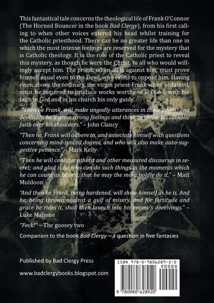 This fantastical Australian tale concerns the theological life of Frank O'Connor (The Horned Bouncer in Bad Clergy), from his first calling to when other voices entered his head whilst training for the Catholic priesthood. There can be no greater life than one in which the most intense feelings are reserved for the mystery that is Catholic theology. It is the role of the Catholic priest to reveal this mystery, as though he were the Christ, to all who would willingly accept him. The priest, when all is against him, must prove himself equal even to the Devil, who exists to oppose him. Having risen above the ordinary, the virgin priest Frank when ordained, must be required to produce works worthy of his God, with his faith in God and in his church his only guide. "Then he Frank, will make ungodly utterances in these pages; and devilishly, he'll grow strong feelings and think to throw his catholic faith over his shoulders." - John Clancy "Then he, Frank will adhere to, and associate himself with questions concerning mind-synced dogma, and who will also make auto-suggestive penance." - Mark Kelly "Then he will consider atheist and other measured discourses in secret; and glad is he who can do such things in the moments which he can count as honest, that he may the more boldly do it." - Matt Muldoon "And then he Frank, being hardened, will show himself as he is. And he, being thrown against a gulf of misery, and for fortitude and grace he rides it, shall then launch into his enemy's deceivings." - Luke Mahone "Feck!" - The goosey two Companion to the book Bad Clergy - a question in five fantasies. Cult books in waiting.