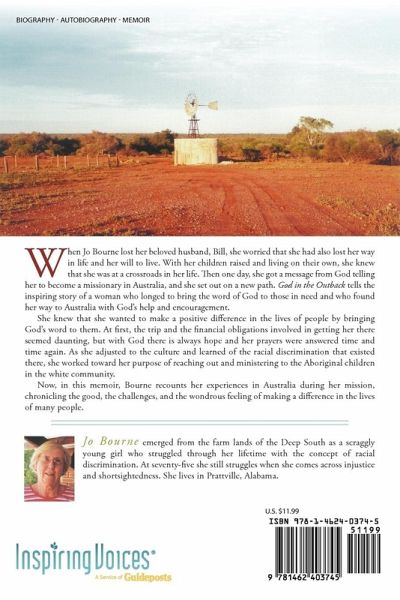 When Jo Bourne lost her beloved husband, Bill, she worried that she had also lost her way in life and her will to live. With her children raised and living on their own, she knew that she was at a crossroads in her life. Then one day, she got a message from God telling her to become a missionary in Australia, and she set out on a new path. God in the Outback tells the inspiring story of a woman who longed to bring the word of God to those in need and who found her way to Australia with God's help and encouragement. She knew that she wanted to make a positive difference in the lives of people by bringing God's word to them. At first, the trip and the financial obligations involved in getting her there seemed daunting, but with God there is always hope and her prayers were answered time and time again. As she adjusted to the culture and learned of the racial discrimination that existed there, she worked toward her purpose of reaching out and ministering to the Aboriginal children in the white community. Now, in this memoir, Bourne recounts her experiences in Australia during her mission, chronicling the good, the challenges, and the wondrous feeling of making a difference in the lives of many people. She knew that she wanted to make a positive difference in the lives of people by bringing God's word to them. At first, the trip and the financial obligations involved in getting her there seemed daunting, but with God there is always hope and her prayers were answered time and time again. As she adjusted to the culture and learned of the racial discrimination that existed there, she worked toward her purpose of reaching out and ministering to the Aboriginal children in the white community. Now, in this memoir, Bourne recounts her experiences in Australia during her mission, chronicling the good, the challenges, and the wondrous feeling of making a difference in the lives of many people.