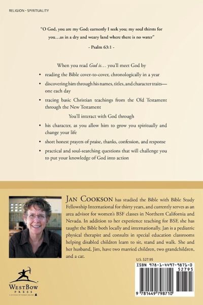 "O God, you are my God; earnestly I seek you; my soul thirsts for you...as in a dry and weary land where there is no water" - Psalm 63:1 - When you read God is... you'll meet God by • reading the Bible cover-to-cover, chronologically in a year • discovering him through his names, titles, and character traits- one each day • tracing basic Christian teachings from the Old Testament through the New Testament You'll interact with God through • his character, as you allow him to grow you spiritually and change your life • short honest prayers of praise, thanks, confession, and response • practical and soul-searching questions that will challenge you to put your knowledge of God into action