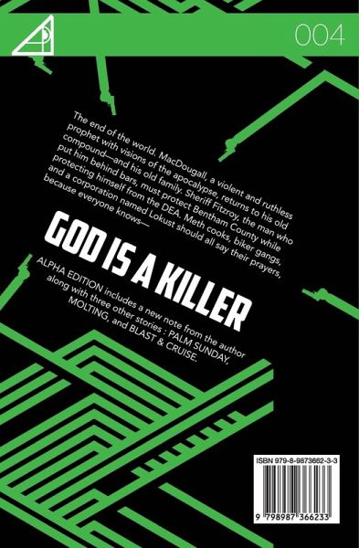 A whirlwind of eschatology, land speculation, and biker warfare. Dead men walk with bedbug psychosis. Skunk work performed on the Sabbath. Corrupt police take revenge on a washed-up boxer. This is GOD IS A KILLER: ALPHA EDITION.