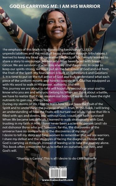 BOOK DESCRIPTIONThe emphasis of this book discusses the hardships of L.I.F.E's unpredictabilities and the result of being steadfast through tribulations.This journey will help us to see just how much of a warrior we really are. It is time to put on the full armor of God and truly understand what each piece of the uniform means, and how to operate in it, no matter what life brings. God has equipped us with His word to walk in His Power, Will, and Will. I have learned how to walk strategically with God and when my life became too difficult, I found myself knowing that God was carrying me. I was not alone. This journey we are about to take is meant to encourage your soul to know who you are and who you belong to. When we fight through a battle, we have to realize that it can weaken our bodies, physically and mentally, if we do not have the right nutrients to gain energy from our source, and get through to the end. During my storms, L.I.F.E. (Lasting Impressions Forever Enjoyed) taught me that I had to learn to eat from the Fruit of the Spirit and understand the purpose of each fruit. In this book, I will bring an understanding of how the fruits will nurture your soul. I know that life is filled with ups and downs, but God made me a survivor! I have never been a scientific person (and I do not dishonor those who are), however, for me, the discoveries of the universe have no comparison to the discoveries of my soul. This book offers a moment just to reflect on yourself, your life, and God's will. "Sharing is Caring"-This is all I desire to do ~LWB Butterfly GOD IS CARRYING ME: I AM HIS WARRIOR