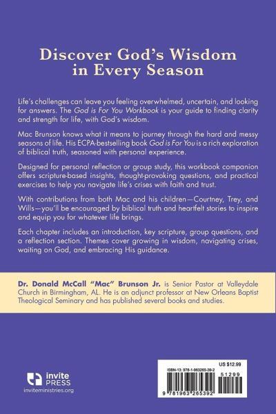 Life's challenges can leave you feeling overwhelmed, uncertain, and looking for answers. The God is For You Workbook is your guide to finding clarity and strength for life, with God's wisdom. Mac Brunson knows what it means to journey through the hard and messy seasons of life. His ECPA-bestselling book God is For You is a rich exploration of biblical truth, seasoned with personal experience. Designed for personal reflection or group study, this workbook companion offers scripture-based insights, thought-provoking questions, and practical exercises to help you navigate life's crises with faith and trust. With contributions from both Mac and his children-Courtney, Trey, and Wills-you'll be encouraged by biblical truth and heartfelt stories to inspire and equip you for whatever life brings. Each chapter includes an introduction, key scripture, group questions, and a reflection section. Themes cover growing in wisdom, navigating crises, waiting on God, and embracing His guidance.