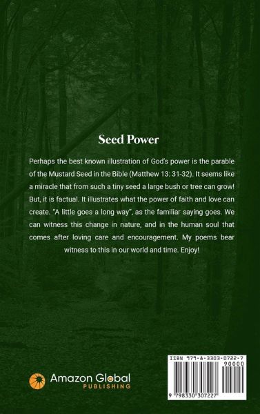 Seed Power Perhaps the best known illustration of God's power is the parable of the Mustard Seed in the Bible (Matthew 13: 31-32). It seems like a miracle that from such a tiny seed a large bush or tree can grow! But, it is factual. It illustrates what the power of faith and love can create. "A little goes a long way", as the familiar saying goes. We can witness this change in nature, and in the human soul that comes after loving care and encouragement. My poems bear witness to this in our world and time. Enjoy!