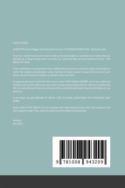 God is good all the time. In this book you get my thoughts, dreams as to what's to come future wise, questions, and more. This book is designed to get you to think of you, your future, your future with God, others, your future generations, the bible, religion, and so much more.