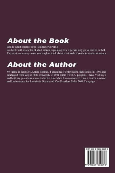 Embark on a thought-provoking and humorous exploration of life's choices in "God is in Full Control: Time Is In Reverse Part II." This collection of short stories serves as a mirror, reflecting relatable situations that might make you laugh or ponder your own decisions. With a blend of wit and introspection, each tale takes you on a journey where divine orchestrations and human choices intersect. Brace yourself for a rollercoaster of emotions as you navigate the unpredictable twists of destiny. In this engaging read, discover how every laughter-filled or reflective moment is a reminder that, indeed, God is in full control. Dive into the pages and experience the profound impact of choices in "God is in Full Control: Time Is In Reverse Part II."