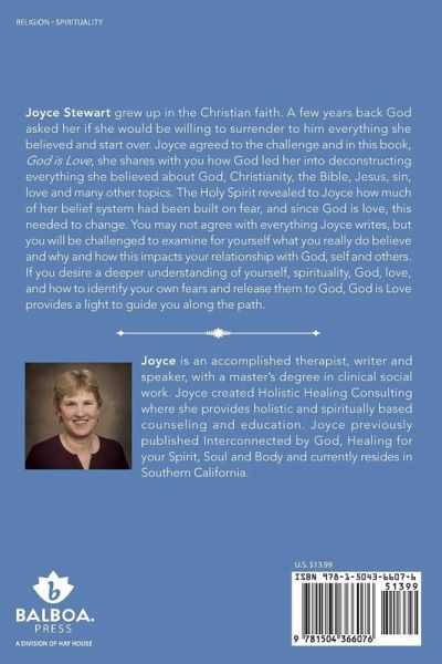 Joyce Stewart grew up in the Christian faith. A few years back God asked her if she would be willing to surrender to him everything she believed and start over. Joyce agreed to the challenge and in this book, God is Love, she shares with you how God led her into deconstructing everything she believed about God, Christianity, the Bible, Jesus, sin, love and many other topics. The Holy Spirit revealed to Joyce how much of her belief system had been built on fear, and since God is love, this needed to change. You may not agree with everything Joyce writes, but you will be challenged to examine for yourself what you really do believe and why and how this impacts your relationship with God, self and others. If you desire a deeper understanding of yourself, spirituality, God, love, and how to identify your own fears and release them to God, God is Love provides a light to guide you along the path.