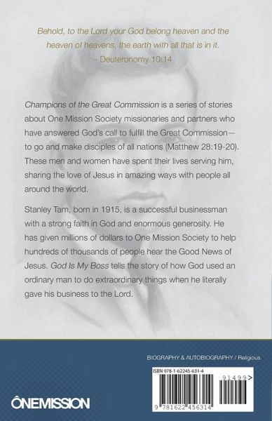 Champions of the Great Commission is a series of stories of One Mission Society missionaries and partners that have answered God’s call to fulfill the Great Commission—to go and make disciples of all nations (Matthew 28:19-20). These men and women have spent their lives serving him, sharing the love of Jesus in amazing ways with people all around the world. Stanley Tam, born in 1915, is a successful businessman with a strong faith in God and great generosity. He has given millions of dollars to One Mission Society to help hundreds of thousands of people hear the Good News of Jesus. God Is My Boss tells the story of how God used an ordinary man to do extraordinary things when he literally gave his business to the Lord. Newly Revised Edition