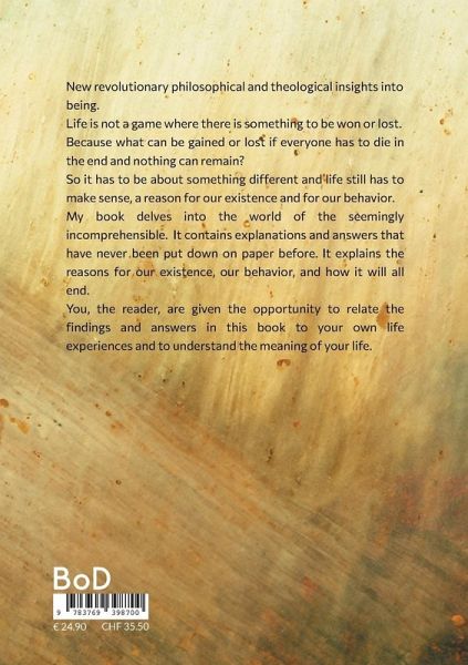 New revolutionary philosophical and theological insights into being. Life is not a game where there is something to be won or lost. Because what can be gained or lost if everyone has to die in the end and nothing can remain? So it has to be about something different and life still has to make sense, a reason for our existence and for our behavior. My book delves into the world of the seemingly incomprehensible. It contains explanations and answers that have never been put down on paper before. It explains the reasons for our existence, our behavior, and how it will all end. You, the reader, are given the opportunity to relate the findings and answers in this book to your own life experiences and to understand the meaning of your life.