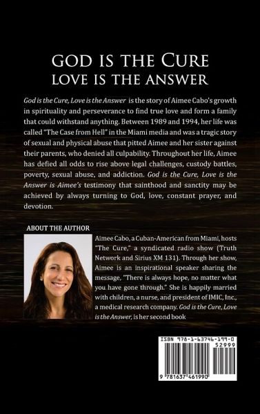 God is the Cure, Love is the Answer is the story of Aimee Cabo's growth in spirituality and perseverance to find true love and form a family that could withstand anything. Between 1989 and 1994, her life was called "The Case from Hell" in the Miami media and was a tragic story of sexual and physical abuse that pitted Aimee and her sister against their parents, who denied all culpability. Throughout her life, Aimee has defied all odds to rise above legal challenges, custody battles, poverty, sexual abuse, and addiction. God is the Cure, Love is the Answer is Aimee's testimony that sainthood and sanctity may be achieved by always turning to God, love, constant prayer, and devotion.