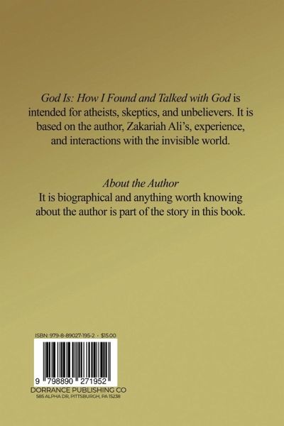 God Is: How I Found and Talked with God is intended for atheists, skeptics, and unbelievers. It is based on the author, Zakariah Ali's, experience, and interactions with the invisible world. About the Author It is biographical and anything worth knowing about the author is part of the story in this book.