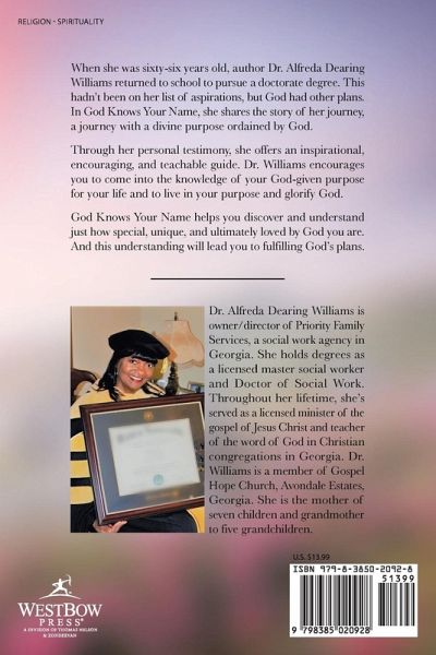 When she was sixty-six years old, author Dr. Alfreda Dearing Williams returned to school to pursue a doctorate degree. This hadn't been on her list of aspirations, but God had other plans. In God Knows Your Name, she shares the story of her journey, a journey with a divine purpose ordained by God. Through her personal testimony, she offers an inspirational, encouraging, and teachable guide. Dr. Williams encourages you to come into the knowledge of your God-given purpose for your life and to live in your purpose and glorify God. God Knows Your Name helps you discover and understand just how special, unique, and ultimately loved by God you are. And this understanding will lead you to fulfilling God's plans.