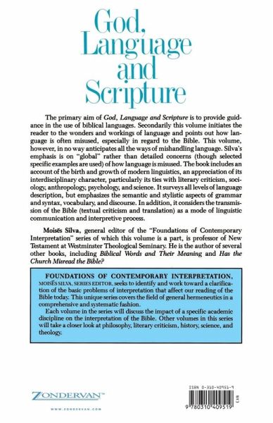 The primary aim of God, Language and Scripture is to provide guidance in the use of biblical languages. Secondarily this volume initiates the reader to the wonders and workings of language and points out how language is often misused, especially in regard to the Bible. This volume, however, in no way anticipates all the ways of mishandling language. Silva's emphasis is on "global" rather than detailed concerns (though selected specific examples are used) of how language is misused. The book includes an account of the birth and growth of modern linguistics, an appreciation of its interdisciplinary character, particularly its ties with literary criticism, sociology, anthropology, psychology, and science. It surveys all levels of language description, but emphasizes the semantic and stylistic aspects of grammar and syntax, vocabulary, and discourse. In addition, it considers the transmission of the Bible (textual criticism and translation) as a mode of linguistic communication and interpretive process.