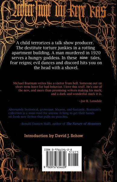 A host of drug dealers meets a foe they cannot kill. The president accidentally invites demons into the country and watches the pope turn into a sabertooth tiger. A man, dead since 1920, lives again in present day Los Angeles to satiate a malevolent goddess. These tales by Michael Boatman will disturb, terrify and traumatize you. Boatman grabs you by throat and drags you kicking and screaming through his prose. With a dash of Lansdale and a smattering of Martina's Wild Cards, the tales within inhabit the dark and nasty side of our souls, and throughout Boatman infuses it all with a keen wit and an eye for detail. And when he lets you up to breathe, like God, you might just find yourself laughing. This is the sort of stuff I like to read as the bells sound midnight. Paul Haines award-winning author of Doorways for the Dispossessed Boatman's debut collection will knock you down and kick you in the teeth. Alternatingly hysterical, grotesque, bizarre, and fantastic, Boatman's collection is a must-read for anyone itching to get their hands on fresh new fiction that pulls no punches. Ronald Damien Malfi, author of The Nature of Monsters and The Fall of Never Michael Boatman writes like a visitor from hell. Someone out on short term leave for bad behavior. I love this stuff. He's one of the new, and more than promising, writers making his mark, and a dark and wonderful mark it is. Joe R. Lansdale