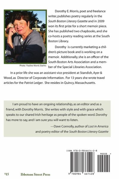 Dorothy E. Morris, poet and freelance writer, publishes poetry regularly in the South Boston Literary Gazette and in 2009 won its first prize for a short memoir piece. She has published two chapbooks, and she co-hosts a poetry reading series at the South Boston Library. Dorothy is currently marketing a children's picture book and is working on a memoir. Additionally, she is an officer of the South Boston Arts Association and a member of the Special Libraries Association. In a prior life she was an assistant vice president at Standish, Ayer & Wood, as Director of Corporate Information. For 13 years she wrote travel articles for the Patriot Ledger. She resides in Quincy, Massachusetts.