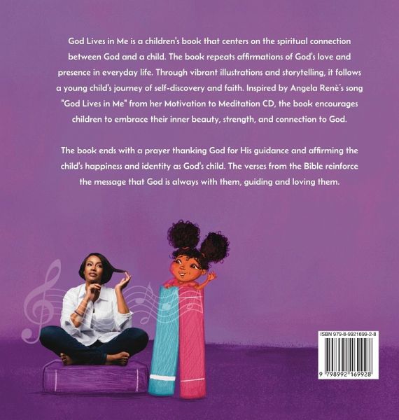 God Lives in Me is a children's book that centers on the spiritual connection between God and a child. The book repeats affirmations of God's love and presence in everyday life. It tells children they belong to God, who lives in them. The text is simple and rhythmic. It encourages children to feel loved and protected from the moment they wake up until they go to sleep. Each page reiterates God's constant presence in their lives through easy-to-remember, comforting words. Inspired by Angela Rene's song "God Lives in Me" from her CD titled Motivation to Meditation, the book encourages children to embrace their inner beauty, strength, and connection to God. The book ends with a prayer thanking God for His guidance and affirming the child's happiness and identity as God's child. The verses from the bible reinforce the message that God is always with them, guiding and loving them.