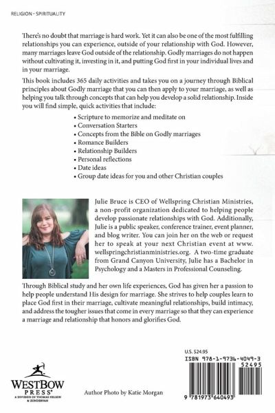 There's no doubt that marriage is hard work. Yet it can also be one of the most fulfilling relationships you can experience, outside of your relationship with God. However, many marriages leave God outside of the relationship. Godly marriages do not happen without cultivating it, investing in it, and putting God first in your individual lives and in your marriage. This book includes 365 daily activities and takes you on a journey through Biblical principles about Godly marriage that you can then apply to your marriage, as well as helping you talk through concepts that can help you develop a solid relationship. Inside you will find simple, quick activities that include: ¿ Scripture to memorize and meditate on ¿ Conversation Starters ¿ Concepts from the Bible on Godly marriages ¿ Romance Builders ¿ Relationship Builders ¿ Personal reflections ¿ Date ideas ¿ Group date ideas for you and other Christian couples