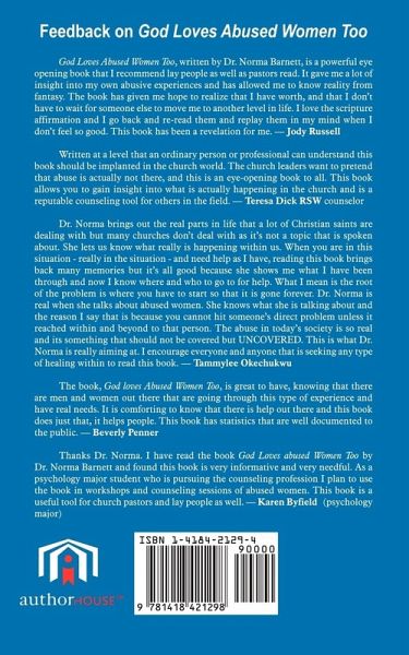 "God Loves Abused Women Too" is an inspiring book that not only does it bring about an awareness for the abuse in many women's lives but how God deals through the abuse. This book demonstrates the skills and strategies used to break the abuse in a woman's life. "God Loves Abused Women Too" shows the true spiritual meaning of how God loves women through an abusive cycle, and how they can get out when they are trapped. There are many audiences within the book such as pastors, missionaries, ministers, psych student scholars and the general public that need to address the issues women have involving abuse. There is an impeccable taste for penmanship within the book that far exceeds its time and the author has produced a fine literary work. These audiences all have a chance to get deeper understanding by looking at the many perspectives on abuse and the journey to healing and wholeness. The audience is captivated not only by the imagery presented but the outcome of the lives of women who are touched by this awesome God. There is something.