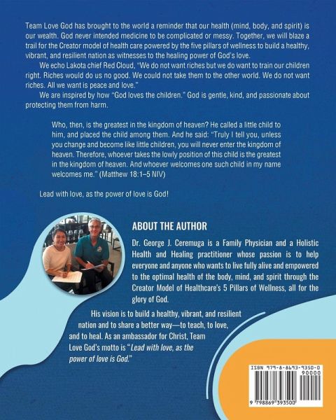 Team Love God has brought to the world a reminder that our health (mind, body, and spirit) is our wealth. God never intended medicine to be complicated or messy. Together, we will blaze a trail for the Creator model of health care powered by the five pillars of wellness to build a healthy, vibrant, and resilient nation as witnesses to the healing power of God's love. We echo Lakota chief Red Cloud, "We do not want riches but we do want to train our children right. Riches would do us no good. We could not take them to the other world. We do not want riches. All we want is peace and love." We are inspired by how "God loves the children." God is gentle, kind, and passionate about protecting them from harm. Who, then, is the greatest in the kingdom of heaven? He called a little child to him, and placed the child among them. And he said: "Truly I tell you, unless you change and become like little children, you will never enter the kingdom of heaven. Therefore, whoever takes the lowly position of this child is the greatest in the kingdom of heaven. And whoever welcomes one such child in my name welcomes me." (Matthew 18:1-5 NIV) Lead with love, as the power of love is God!