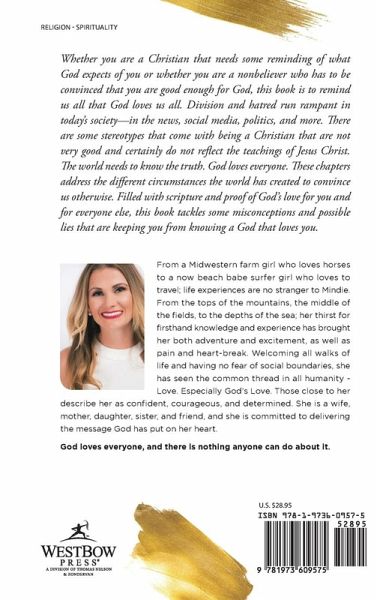 Whether you are a Christian that needs some reminding of what God expects of you or whether you are a nonbeliever who has to be convinced that you are good enough for God, this book is to remind us all that God loves us all. Division and hatred run rampant in todays societyin the news, social media, politics, and more. There are some stereotypes that come with being a Christian that are not very good and certainly do not reflect the teachings of Jesus Christ. The world needs to know the truth. God loves everyone. These chapters address the different circumstances the world has created to convince us otherwise. Filled with scripture and proof of Gods love for you and for everyone else, this book tackles some misconceptions and possible lies that are keeping you from knowing a God that loves you.