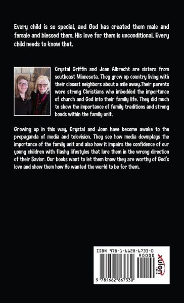 Every child is so special, and God has created them male and female and blessed them. His love for them is unconditional. Every child needs to know that. Crystal Griffin and Joan Albrecht are sisters from southeast Minnesota. They grew up country living with their closest neighbors about a mile away.Their parents were strong Christians who imbedded the importance of church and God into their family life. They did much to show the importance of family traditions and strong bonds within the family unit. Growing up in this way, Crystal and Joan have become awake to the propaganda of media and television. They see how media downplays the importance of the family unit and also how it impairs the confidence of our young children with flashy lifestyles that lure them in the wrong direction of their Savior. Our books want to let them know they are worthy of God's love and show them how He wanted the world to be for them.