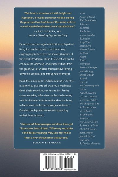 Eknath Easwaran (1910–1999) is respected around the world as a teacher of meditation and an authentic guide to world wisdom. His method of passage meditation fits within any faith, philosophy, or lifestyle. In 1961 Easwaran founded the Blue Mountain Center of Meditation, which carries on his work today. Easwaran's books include commentaries on the great saints and sages of the world's traditions and have been translated into 26 languages. His translations of the Indian spiritual classics (The Bhagavad Gita, The Upanishads and The Dhammapada) have been widely acclaimed and are all bestsellers in their field, and more than 2 million of his books are in print. A gifted teacher who lived for many years in the West, Easwaran lived what he taught, giving him enduring appeal as a teacher and author of deep insight and warmth.