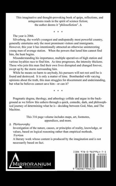 This imaginative and thought-provoking book of quips, reflections, and antagonisms reads in the spirit of science fiction. The author deems it "philosofiction". Δ * * * The year is 2066. The world's youngest and undisputedly most powerful country, generally entertains only the most prominent visitors and immigrants. However, this year it has intentionally attracted an otherwise uninteresting young man of average station. When the powers that lured him cannot find him, the hunt begins. Misunderstanding his importance, multiple operatives of high station and various loyalties race to find him. As time progresses, the intensity thickens. Those who join this man find their own lives disrupted and changed forever, swept up by the storm surrounding him. While he means no harm to anybody, his pursuers will not rest until he is found and destroyed. It is only a matter of time. Bombarded with varying opinions about the truth, this man struggles for discernment and understanding, but what he believes cannot save him - or can it? * * * Pragmatic dogma, theology, and atheology collide and argue in the background as we follow this unhero through a quick, comedic, dark, and philosophical journey of determining what he is - deciding between God, Man, and The Machine. This 280-page volume includes maps, art, footnotes, appendices, and more. Δ Phi·los·o·phy Investigation of the nature, causes, or principles of reality, knowledge, or values, based on logical reasoning rather than empirical methods. Fic·tion A literary work whose content is produced by the imagination and is not necessarily based on fact.