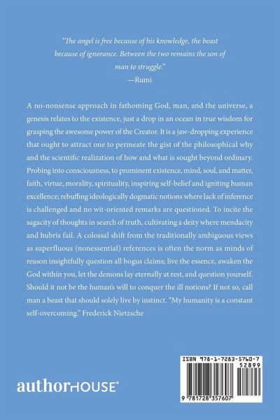 "The angel is free because of his knowledge, the beast because of ignorance. Between the two remains the son of man to struggle." -Rumi A no-nonsense approach in fathoming God, man, and the universe, a genesis relates to the existence, just a drop in an ocean in true wisdom for grasping the awesome power of the Creator. It is a jaw-dropping experience that ought to attract one to permeate the gist of the philosophical why and the scientific realization of how and what is sought beyond ordinary. Probing into consciousness, to prominent existence, mind, soul, and matter, faith, virtue, morality, spirituality, inspiring self-belief and igniting human excellence; rebuffing ideologically dogmatic notions where lack of inference is challenged and no wit-oriented remarks are questioned. To incite the sagacity of thoughts in search of truth, cultivating a deity where mendacity and hubris fail. A colossal shift from the traditionally ambiguous views as superfluous (nonessential) references is often the norm as minds of reason insightfully question all bogus claims; live the essence, awaken the God within you, let the demons lay eternally at rest, and question yourself. Should it not be the human's will to conquer the ill notions? If not so, call man a beast that should solely live by instinct. "My humanity is a constant self-overcoming." Frederick Nietzsche
