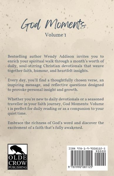 Bestselling author Wendy Addison invites you to enrich your spiritual walk through a month's worth of daily, soul-stirring Christian devotionals that weave together faith, humour, and heartfelt insights. Every day, you'll find a thoughtfully chosen verse, an inspiring message, and reflective questions designed to provoke personal insight and growth. Whether you're new to daily devotionals or a seasoned traveller in your faith journey, God Moments is perfect for daily reading or as a companion to your quiet time. Embrace the richness of God's word and discover the excitement of a faith that's fully awakened. This book is the first of a series. Visit wendyaddison.com for more.