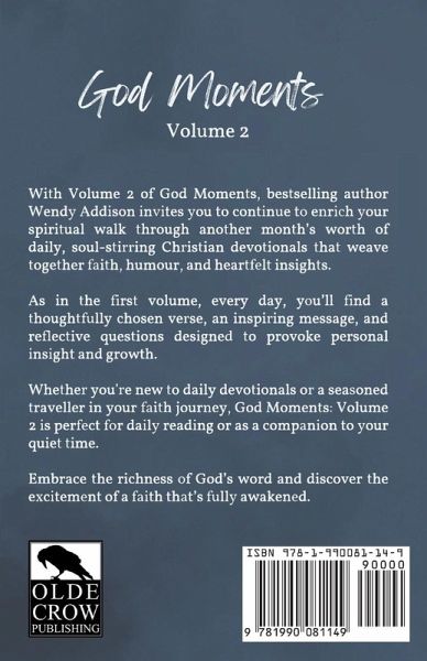 Bestselling author Wendy Addison returns with another month of soul-stirring devotionals designed to awaken and deepen your faith. Each day, you'll encounter a carefully chosen verse, an inspiring reflection, and thought-provoking questions to help you grow in your walk with the Lord. With Wendy's signature blend of faith, humour, and heartfelt insight, these devotionals will encourage and challenge you in all the best ways. Whether you're continuing your journey from Volume 1 or discovering God Moments for the first time, this collection is perfect for daily reading or as a companion to your quiet time. Let God's word come alive and draw you closer to Him. This book is the second of a series. Visit wendyaddison.com for more.